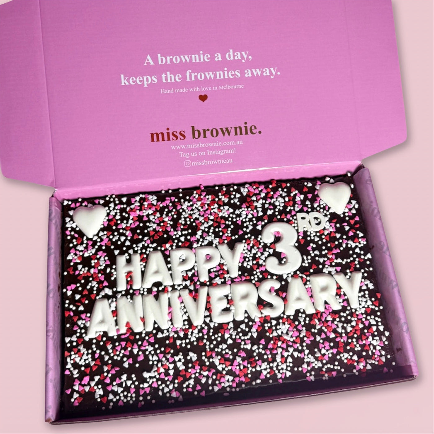 All brownies are wrapped in grease proof paper to protect the brownies lettering and other toppings from being moved or smudged in transit. The brownie is protected by layers of bubble wrap on the top and bottom of the brownie so that when the box is closed, its a nice snug & protected fit. The box is then shrink wrapped to avoid little critters getting inside and finally placed in a bubble wrap protected satchel to protect the beautiful box from damage (we know Aus Post like to throw parcels around).